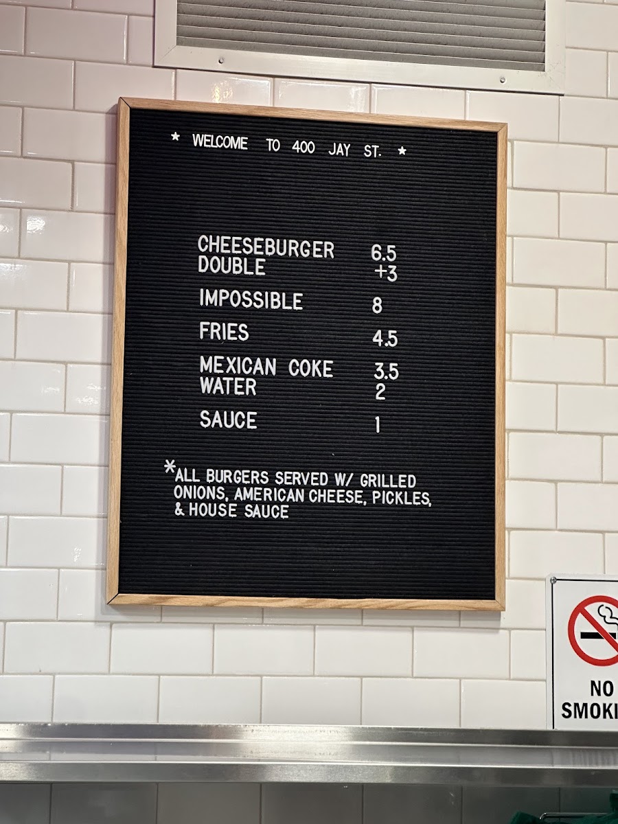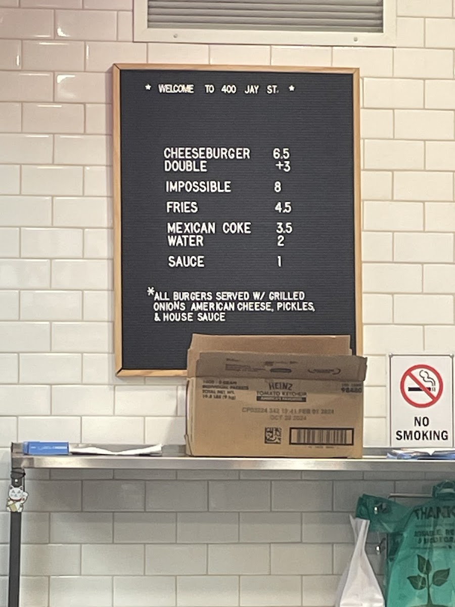 “ Out of all the smash burgers that I have had in New York. You guys are always A1 in my book, service here was top notch, shout out to the person working behind the counter. Burger is priced well for what you get. ”